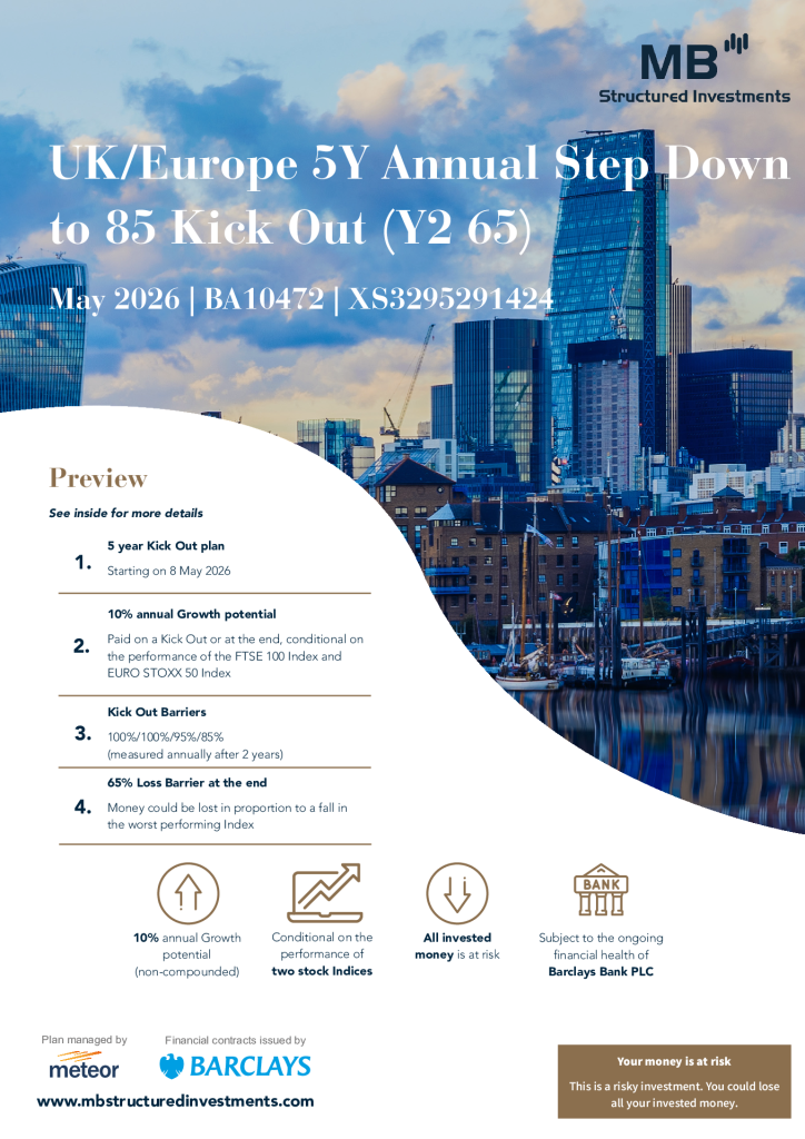 This plan is made possible by the expertise of MB Structured Investments Ltd, Meteor Asset Management Ltd, Meteor Investment Manangement Ltd and Barclays Bank PLC. MB will use their money to buy financial contracts from the Counterparty (Barclays Bank PLC) on their behalf. The contracts are tailored to achieve the investment objectives of this plan.