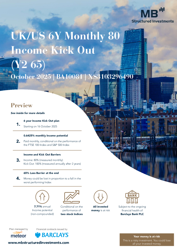 This plan is made possible by the expertise of MB Structured Investments Ltd, Meteor Asset Management Ltd, Meteor Investment Manangement Ltd and Barclays Bank PLC. MB will use their money to buy financial contracts from the Counterparty (Barclays Bank PLC) on their behalf. The contracts are tailored to achieve the investment objectives of this plan.