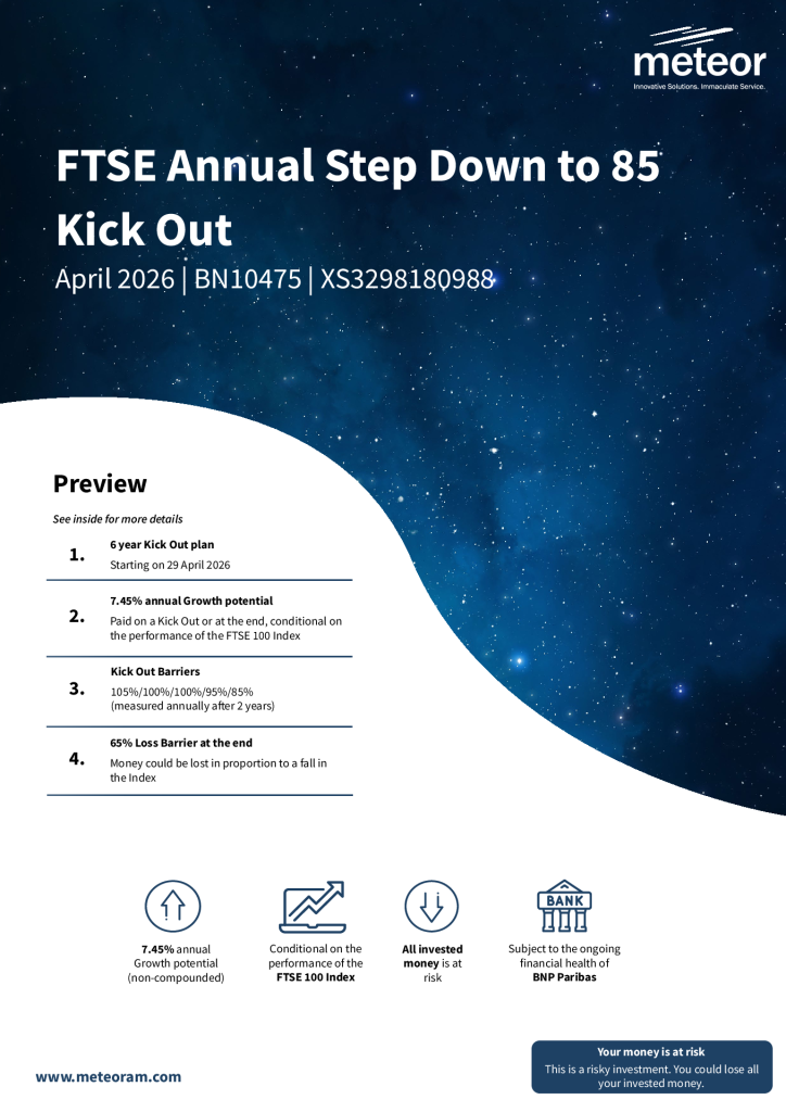 The Meteor FTSE Annual Step Down to 85 Kick Out Plan is a maximum six year three week investment offering a potential gross return of 7.45% for each year the plan runs, subject to the performance of the FTSE 100 index.