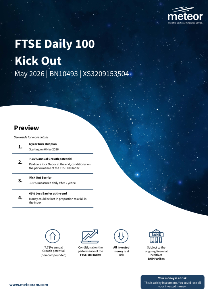The product is issued in association with a third party, known as a ‘counterparty’ who provide the returns and the guarantees. If this third party goes bankrupt, you could lose some or all of your money. This type of product does not benefit from Financial Services Compensation Scheme protection