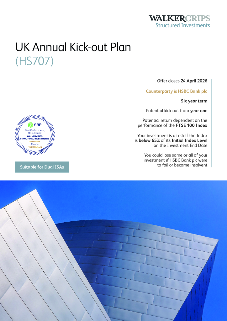 The product is issued in association with a third party, known as a ‘counterparty’ who provide the returns and the guarantees. If this third party goes bankrupt, you could lose some or all of your money. This type of product does not benefit from Financial Services Compensation Scheme protection