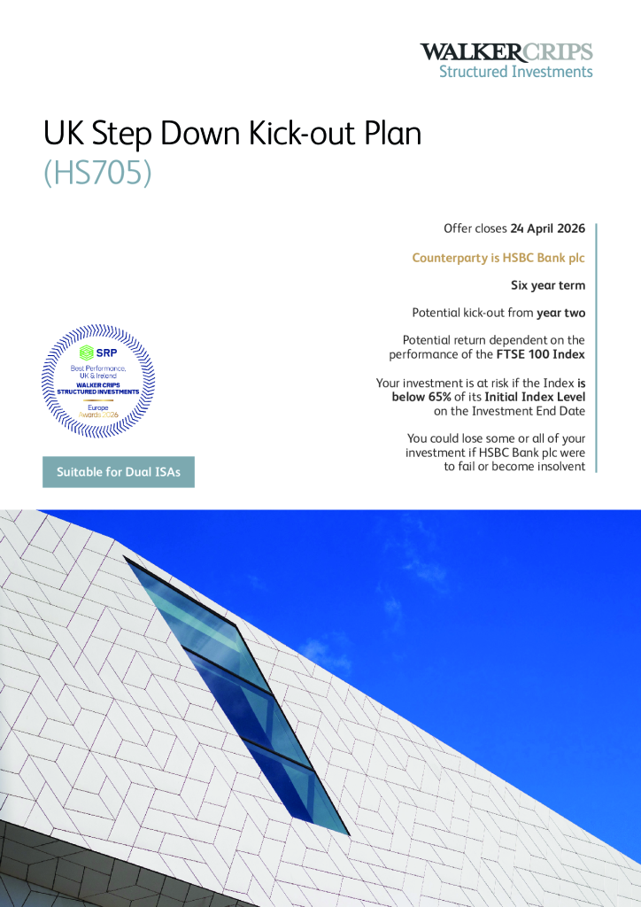 The product is issued in association with a third party, known as a ‘counterparty’ who provide the returns and the guarantees. If this third party goes bankrupt, you could lose some or all of your money. This type of product does not benefit from Financial Services Compensation Scheme protection