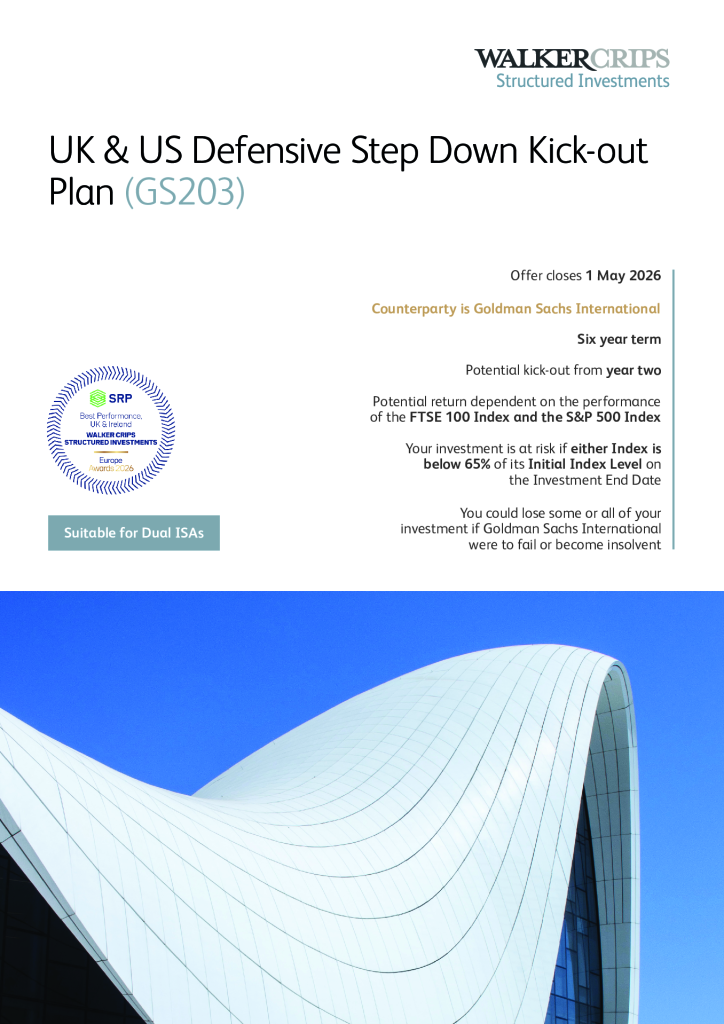 When you invest in the Walker Crips UK & US Defensive Step Down Kick Out Plan, you may receive an accumulated return of 8.20% for each year of your investment depending on the performance of the FTSE 100 Index and S&P 500 Index.